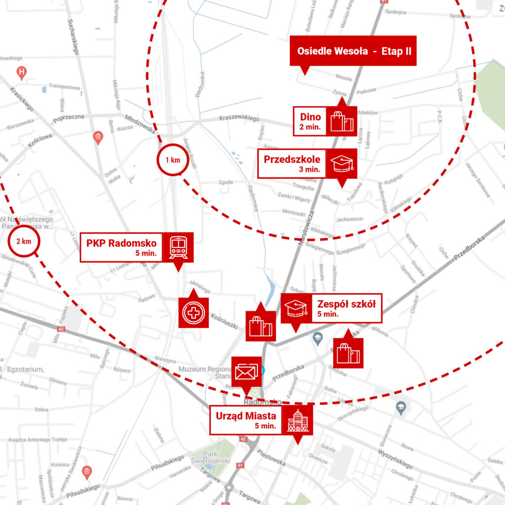 Osiedle znajduje się w spokojnej części miasta, gdzie dominuje zabudowa domów jednorodzinnych, a w okolicy jest mnóstwo zieleni. Bardzo blisko domów, bo zaledwie 500 metrów dalej, znajduje się market Dino, w którym można robić bieżące zakupy. W tak bliskiej odległości znajdziesz również stację benzynową, kwiaciarnię i kilka innych sklepów spożywczych oraz punktów usługowych. Centrum Radomska jest oddalone od Osiedla Wesoła o 3,3 km. Można więc do niego szybko dotrzeć autem (8 minut) lub dojść pieszo (27 minut). Tutaj otrzymuje się dostęp do pełnej infrastruktury – urzędów, punktów medycznych, wielu restauracji czy też centrum handlowego.