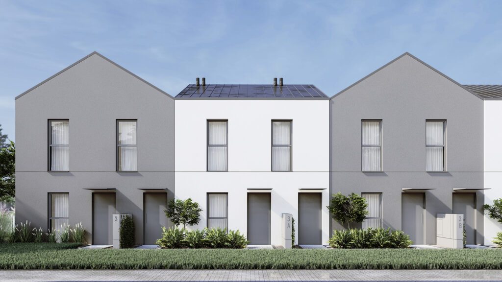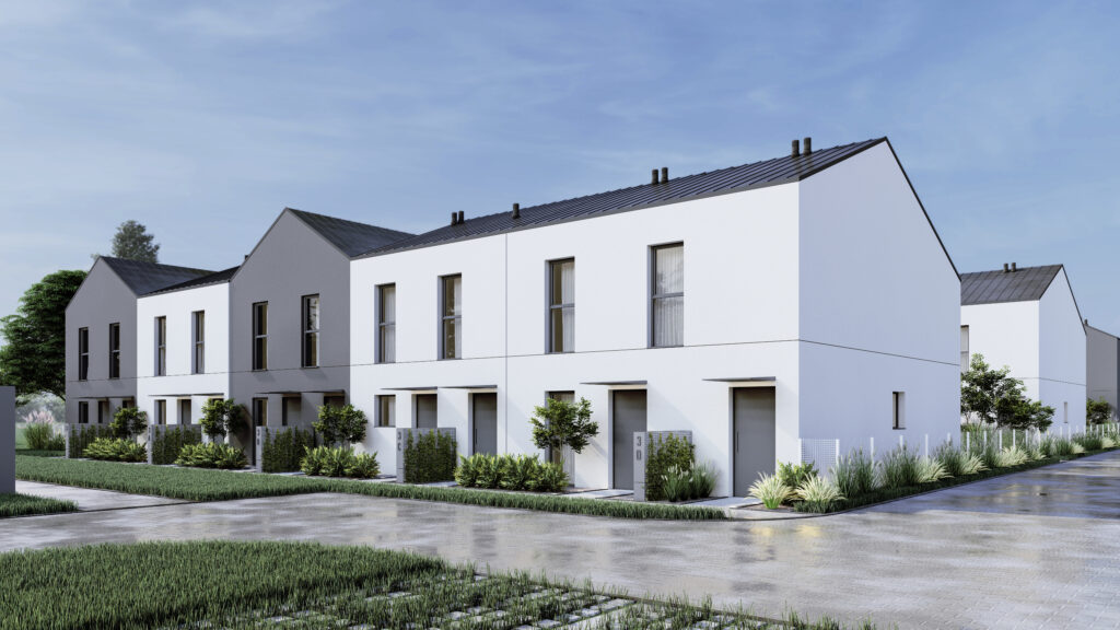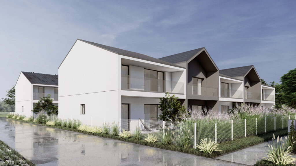 II etap Osiedla Wesoła to harmonijne połączenie funkcjonalności i estetyki. Kameralne osiedle składa się z 15 budynków w zabudowie szeregowej, zaprojektowanych w nowoczesnym stylu, z prostymi bryłami i elewacją w kolorach bieli oraz grafitu. Dwuspadowe dachy oraz detale wykończeniowe podkreślają elegancję całej inwestycji, pięknie wpisując się w otoczenie.